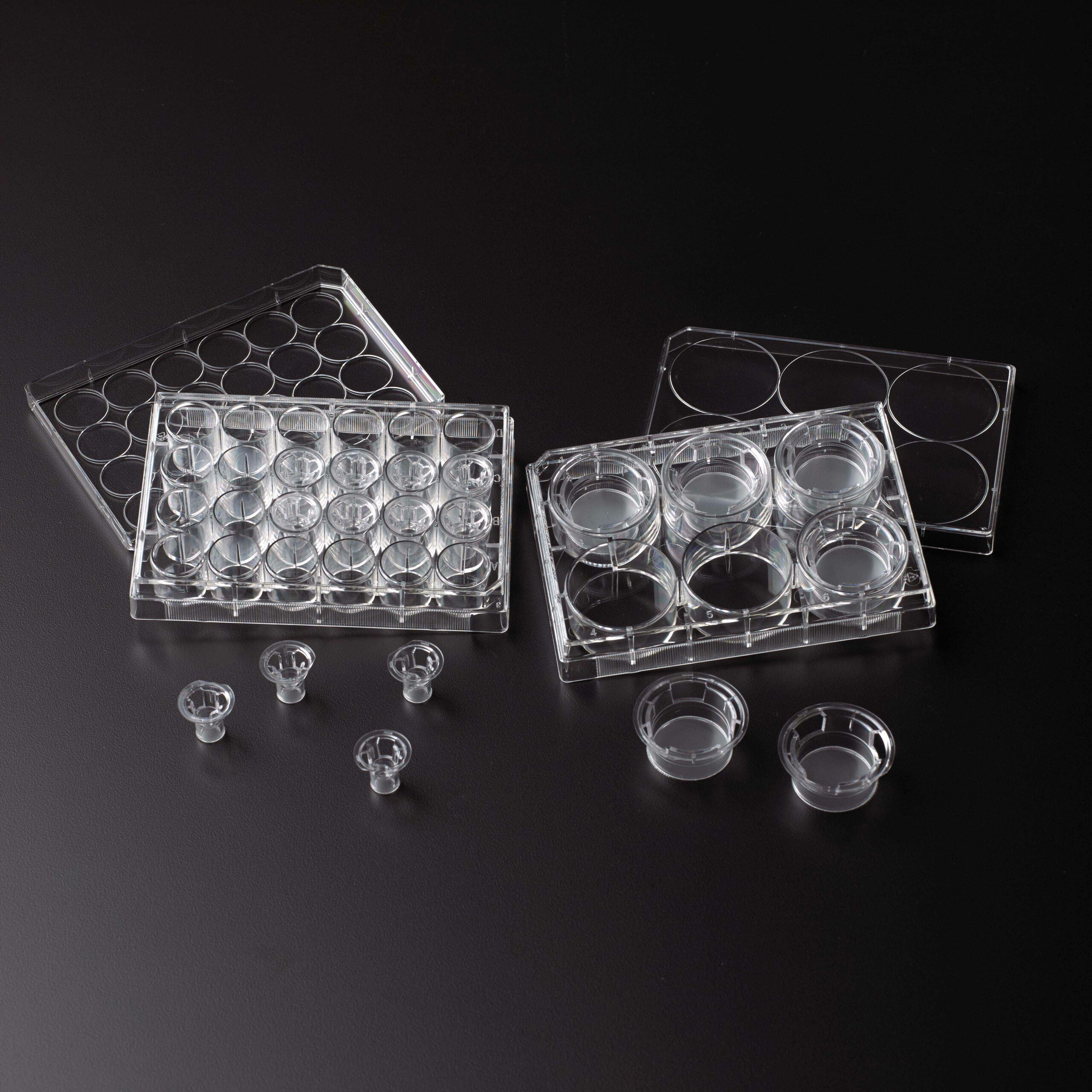 Permeable Cell Culture Inserts mimic in vivo conditions. Inserts center in wells, preventing membrane from touching sides and wicking between insert and side wall. Membrane remains suspended above well bottom, allowing co-culture: grow one cell line inside insert, and another below in the well. Ideal for drug transfer assays, transport studies, migration assays, and cell-cell interaction studies. Non-Treated Plates sold separately; carrier plate is Tissue Culture Treated which encourages cell adhesion.