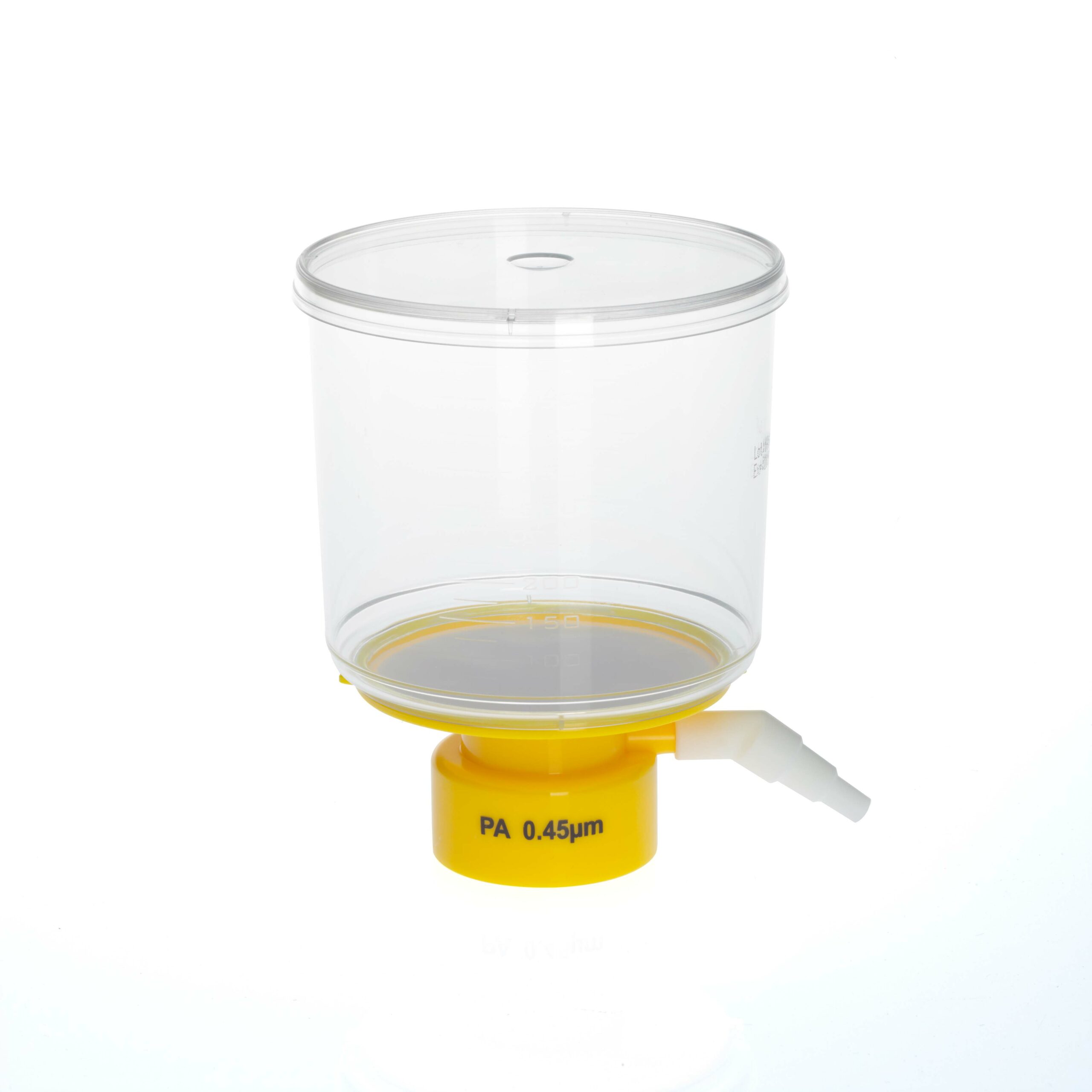 Bottle top filters do not include solution bottles-to-read molded graduations marks on bottle top filter. Bottle top filters fit on CELLTREAT® solution bottles or other standard 45mm threaded solution storage bottles. Polyethersulfone (PES) membrane is for high flow and low binding. Nylon (PA) membrane has excellent chemical compatibility and does not require pre-wetting. Angled hose barb adapter fits three size hose diameters and prevents the filter from tipping.